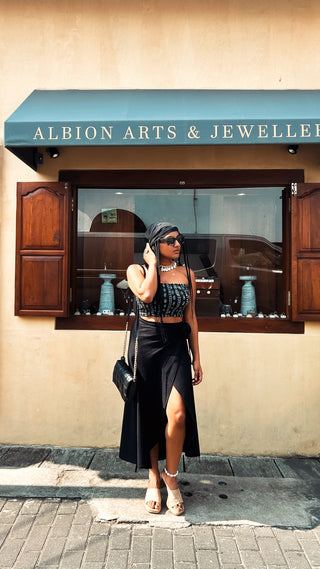 Our versatile best-selling bandeau top in luxurious sailor blue indigo Indian cotton hand batik printed with pinstripes.