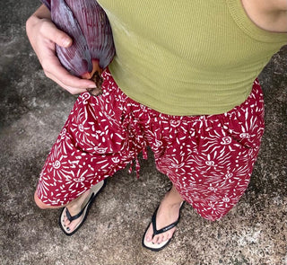 Our breezy high-waisted 'Scoot Me' long bermuda shorts made in luxuriously light Indian cotton batik printed with olive green pinstripes. These comfortable wide-leg shorts feature two pockets and an elasticated and drawstring waist, allowing for sizing up to 81cm (32 inch) waist and 101cm (40 inch) hips.