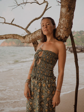 Our versatile multiway shirred bandeau ruffle top in luxurious light Indian cotton hand-batiked with golden yellow suns.