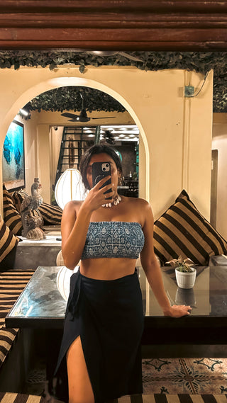 Our versatile best-selling bandeau top in luxurious tie-dye effect Indigo Blue hand block printed with abstract daisy motifs.