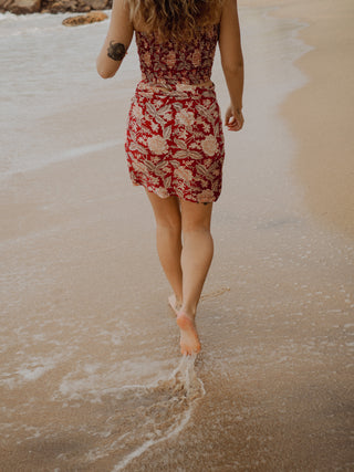 Our best-selling Grab Me wrap skirts are a go-to wardrobe staple. Made with breezy blue and white Indian cotton hand-block printed with blue abstract daisies.