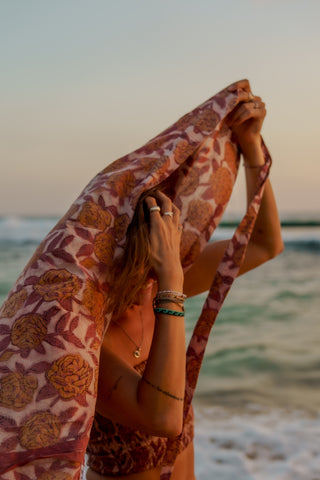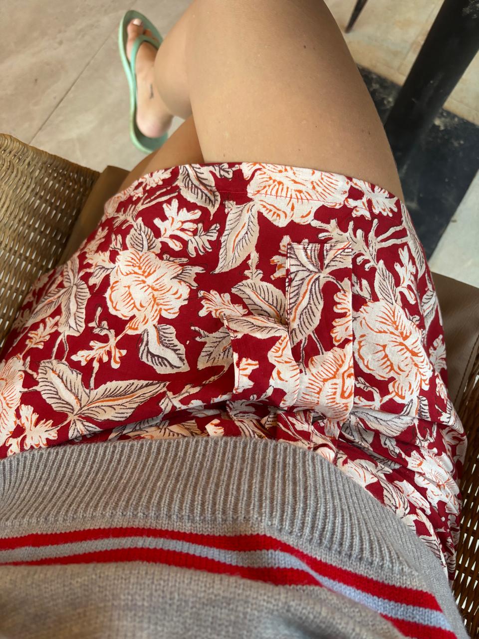 Our best-selling 'Grab Me' wrap skirts are a popular wardrobe staple. Made with luxurious winterberry dark red cotton hand-dyed using traditional block-printing techniques in vintage red floral prints.